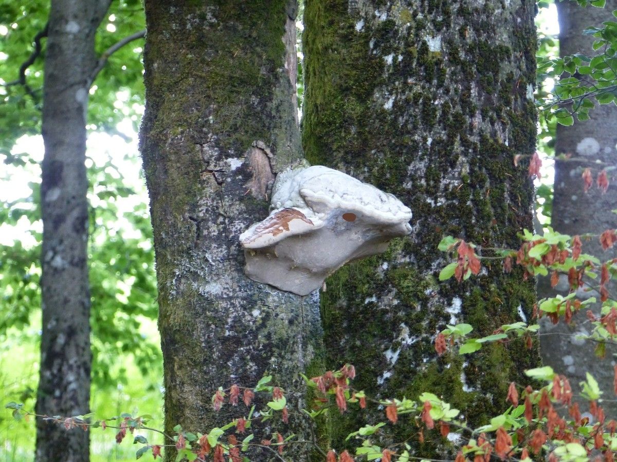 Le sentier serpente en sous-bois à proximité du lac. Sur un tronc, un gros champignon en forme de tête de mouton, sans doute un Polypore, parasite du hêtre (Amadouvier)?