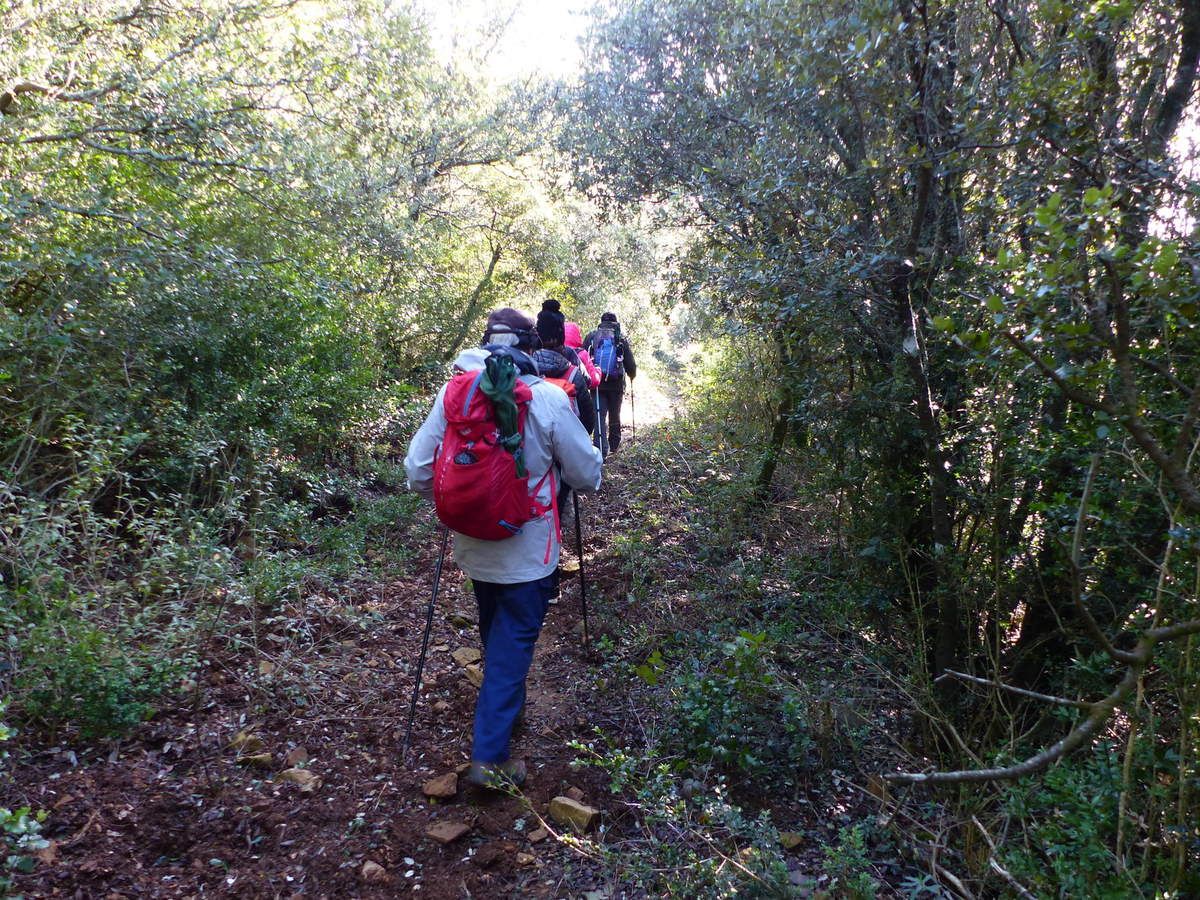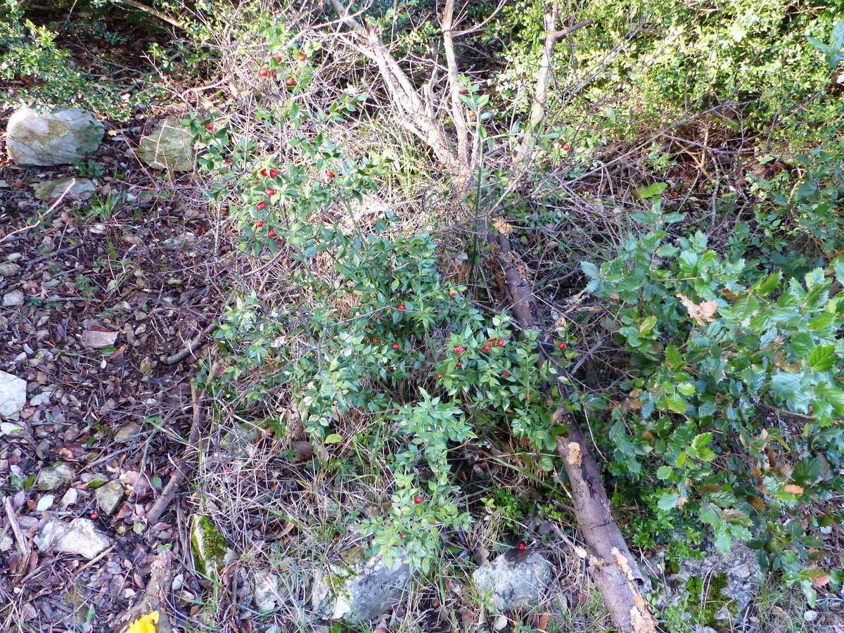 Le chemin grimpe à travers les chênes et les buis parsemés de quelques touches rouges de Fragon ( Petit houx).