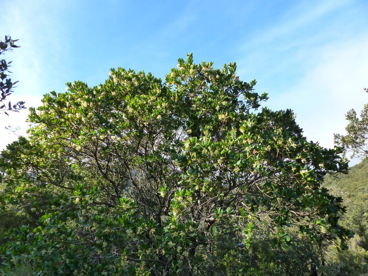 Parfois, on rencontre un arbousier : Arbustus Unedo ( Famille des Ericacées ) avec ses fleurs blanches en grelots, visibles en automne comme en hiver.