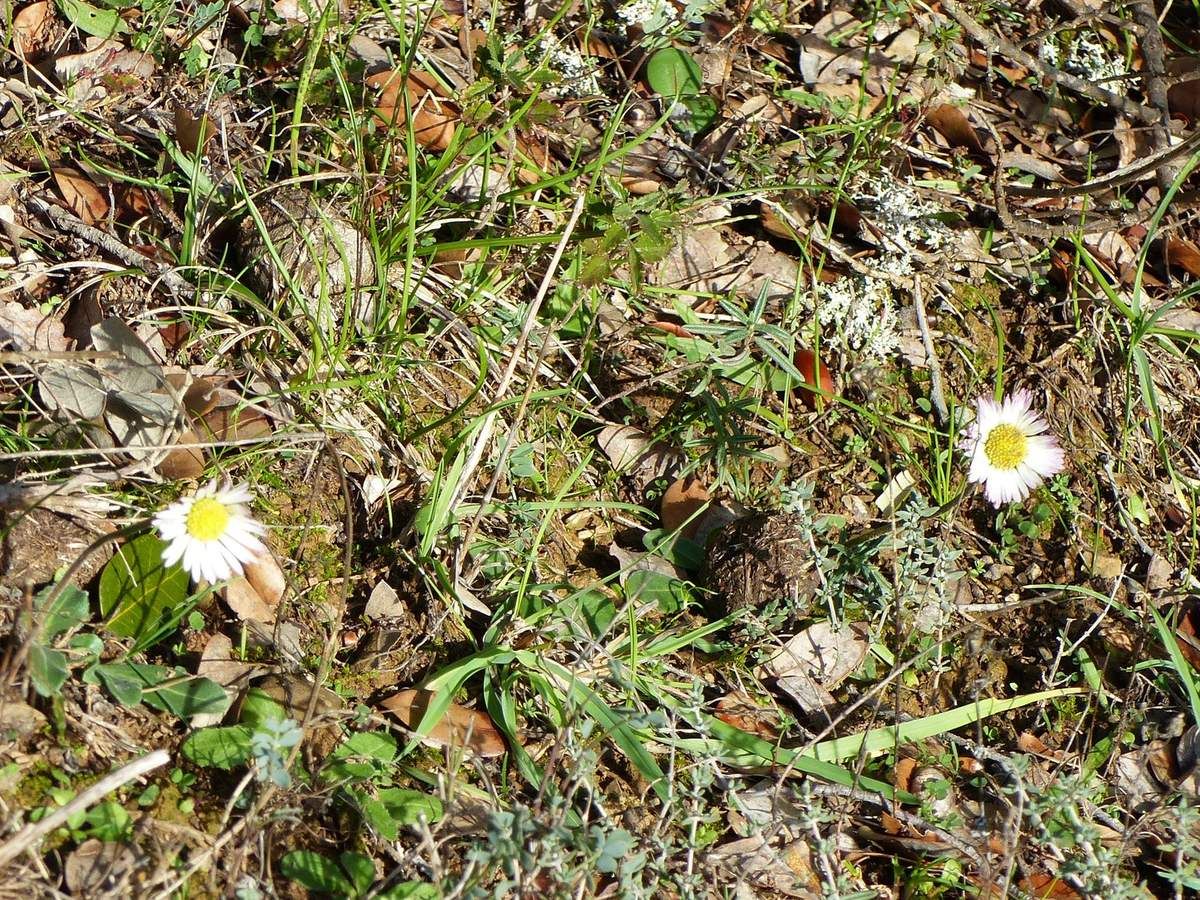 Bien à l'abri du vent et au soleil : quelques Pâquerettes d'automne ou des bois : Bellis Sylvestris ( Famille des Ericacées ), encore visibles en plein hiver.